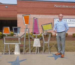 Unity, By Nathan Pierce, is the perfect piece for its spot welcoming students at the entrance of Northwood Elementary. Locked arm in arm, this glistening family of steel and colored plexiglass inspire kids to bike, play, and even sing. A heart at the center of one of the figures is an emblem for the love this piece is meant to inspire in children every day.